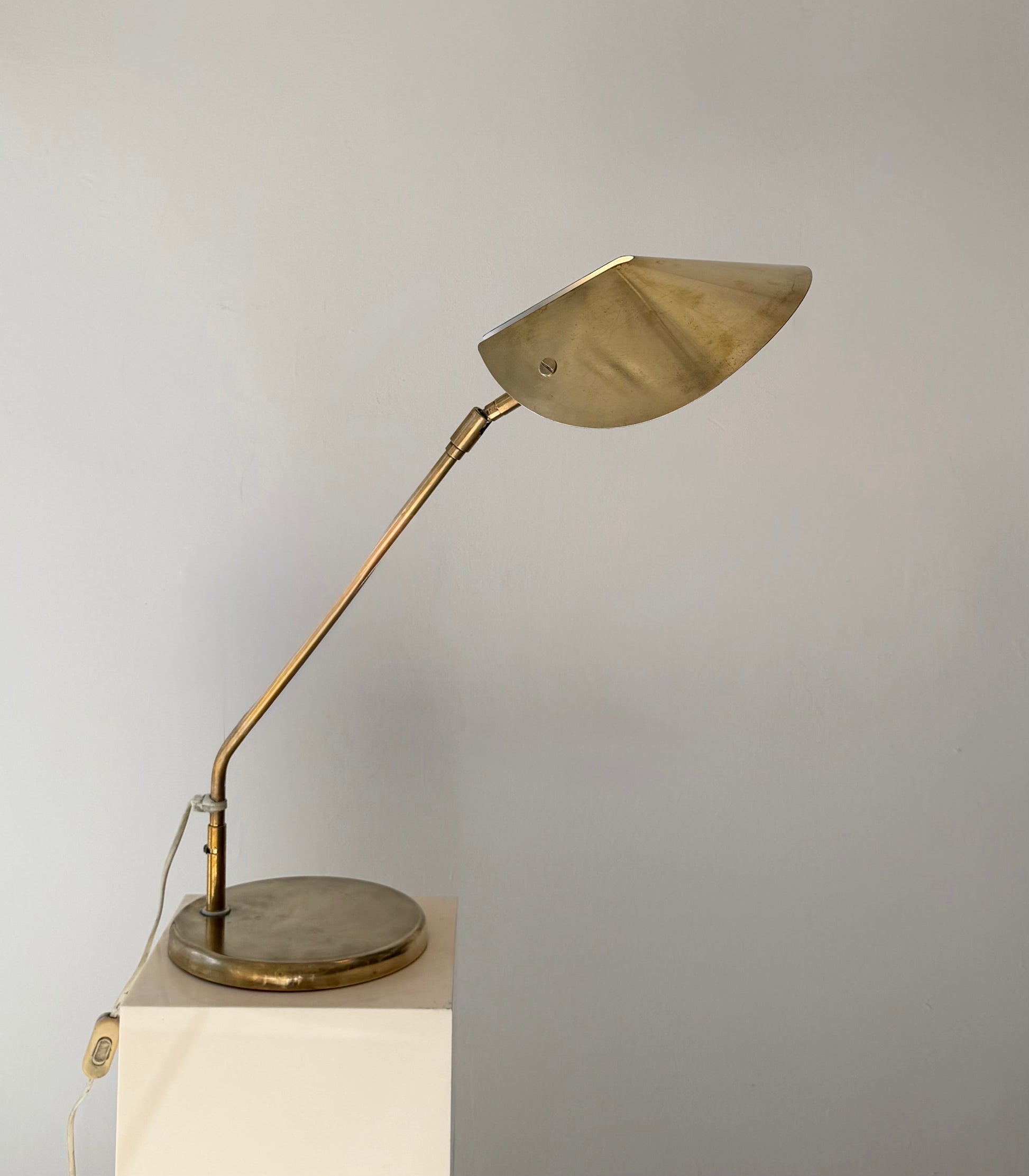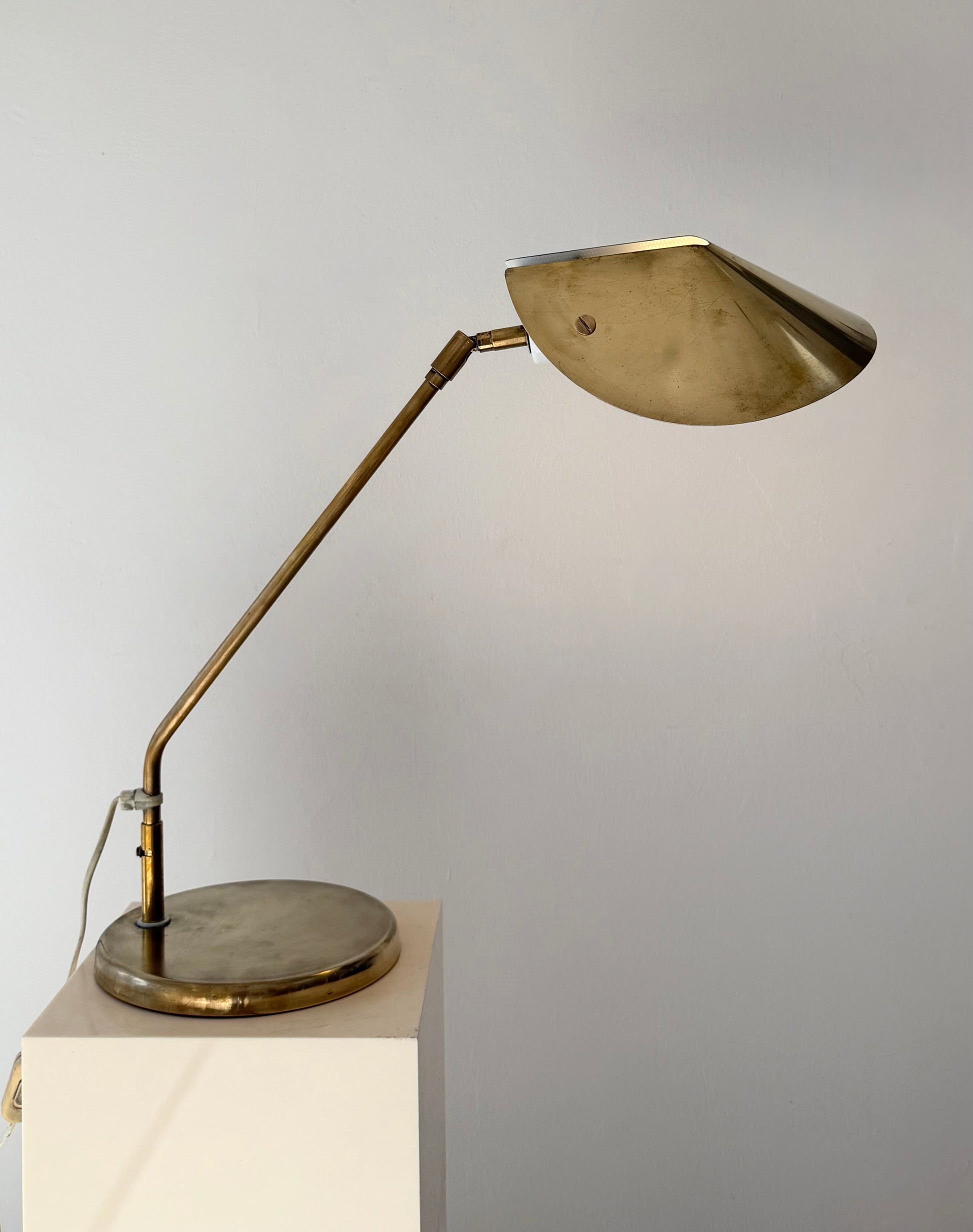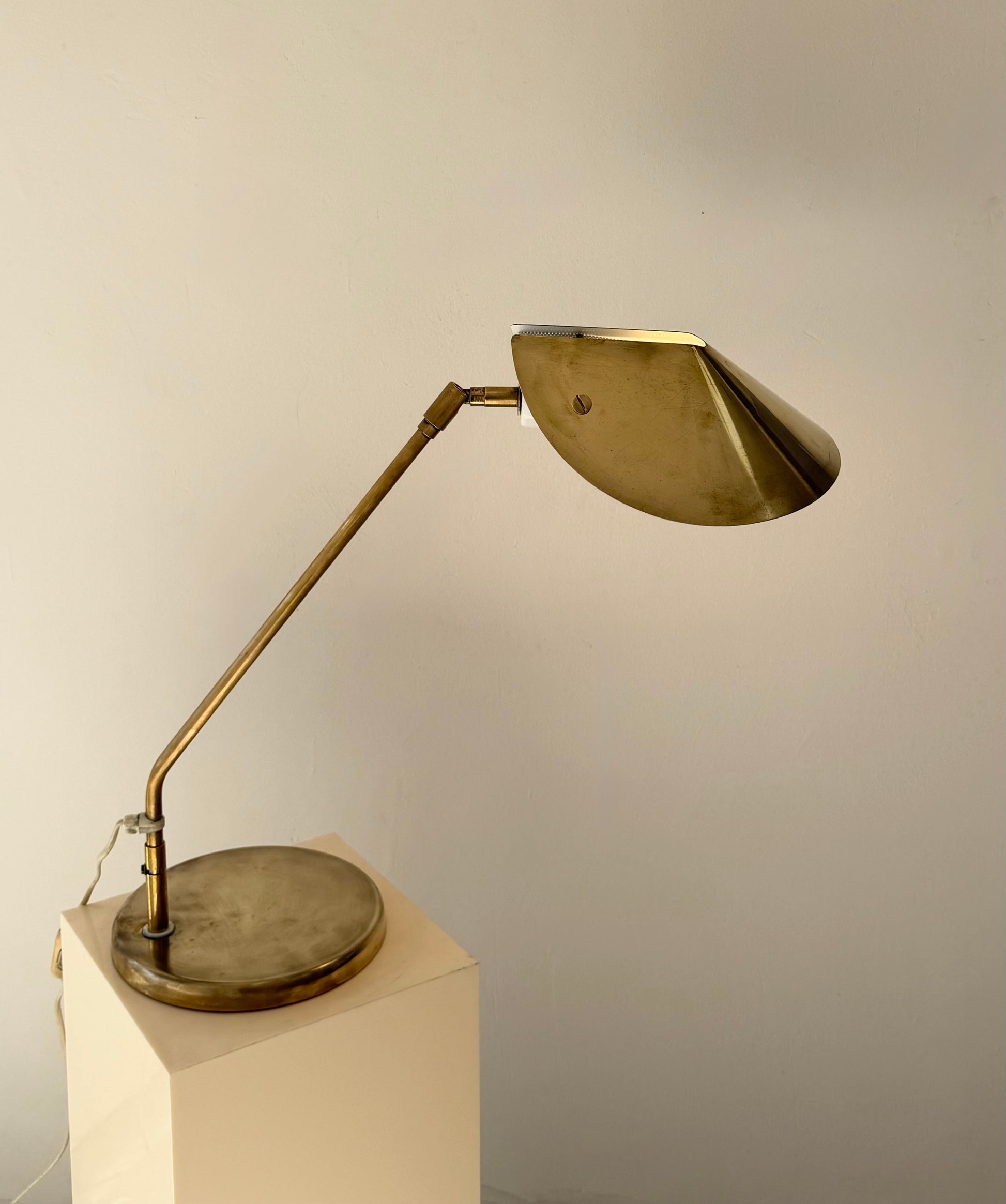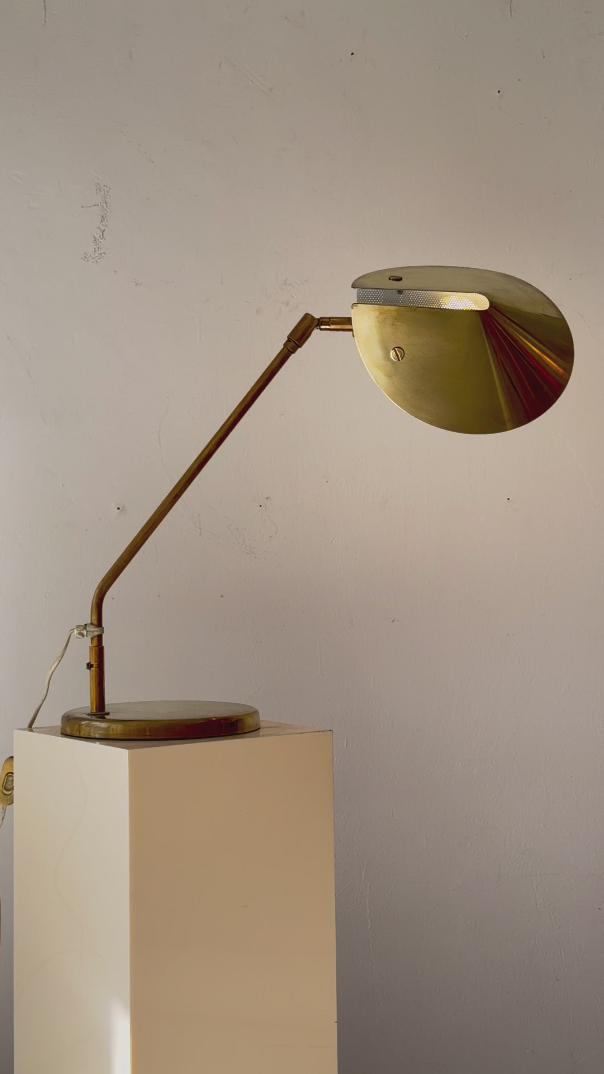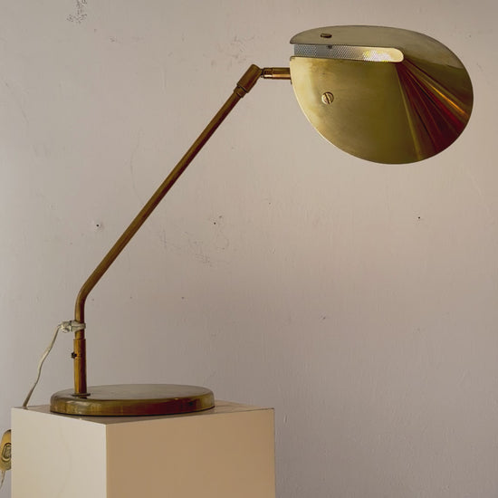 Brass construction with articulated arm and adjustable shade.